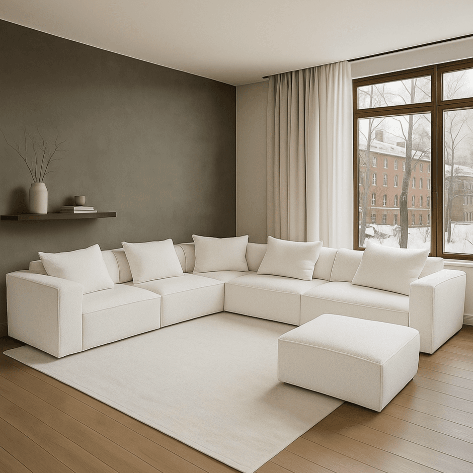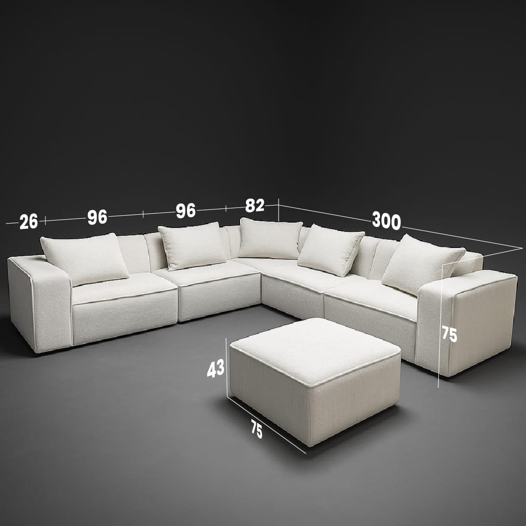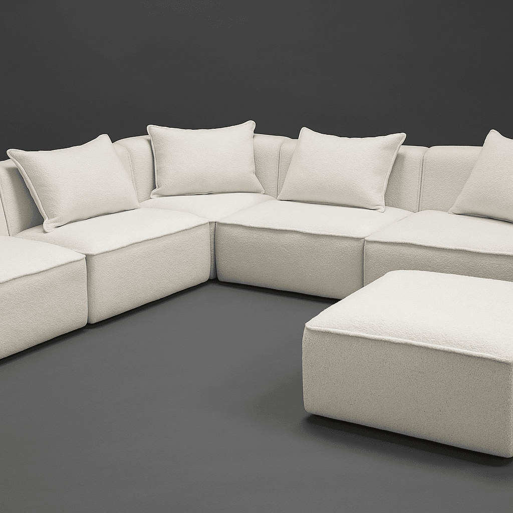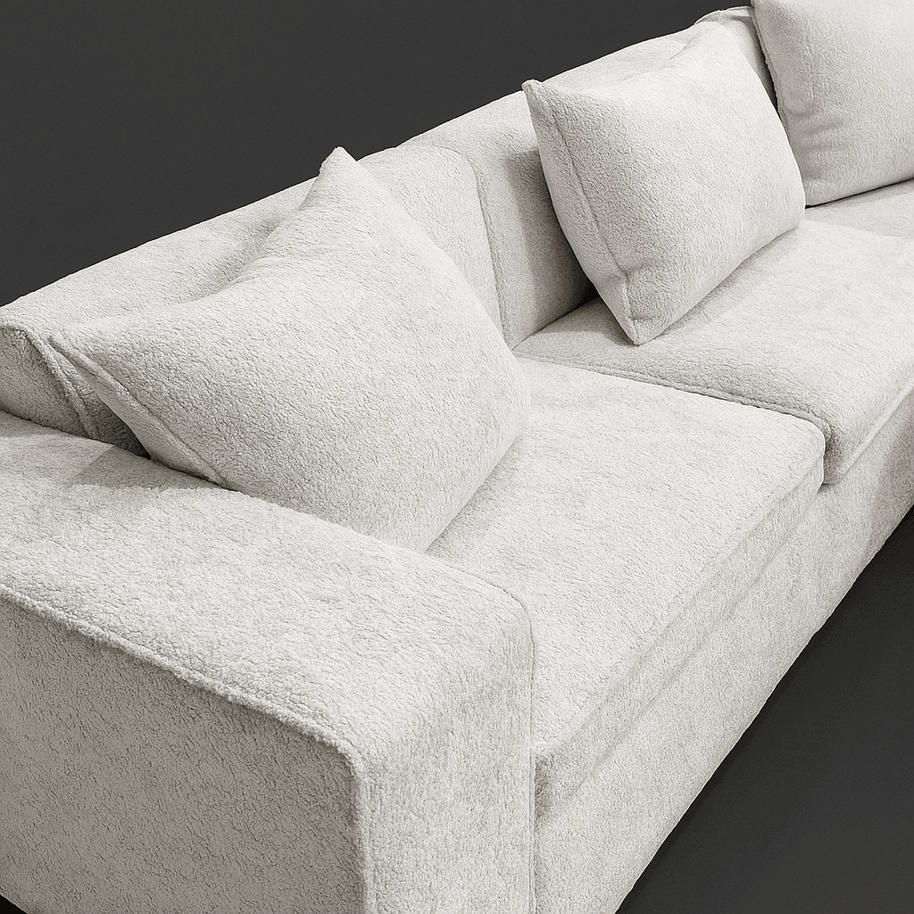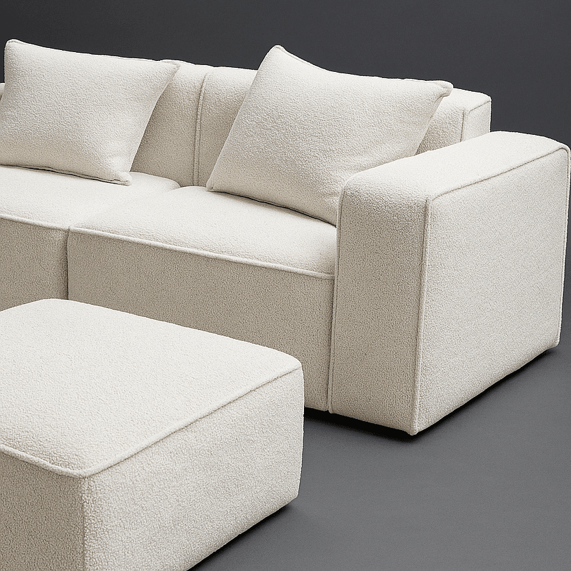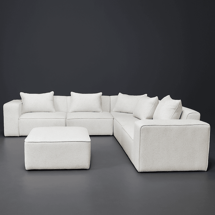 La Sala Modular Minimal combina elegancia, confort y flexibilidad, permitiéndote personalizar cada espacio a tu gusto. Su tapizado en tela tipo ovejera brinda una textura suave y cálida, ideal para crear un ambiente acogedor, mientras que sus patas en roble garantizan resistencia y un toque de sofisticación.