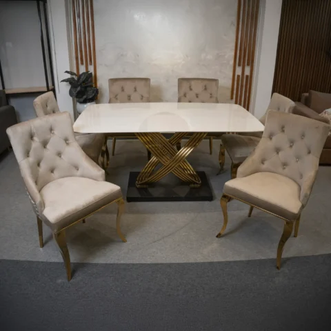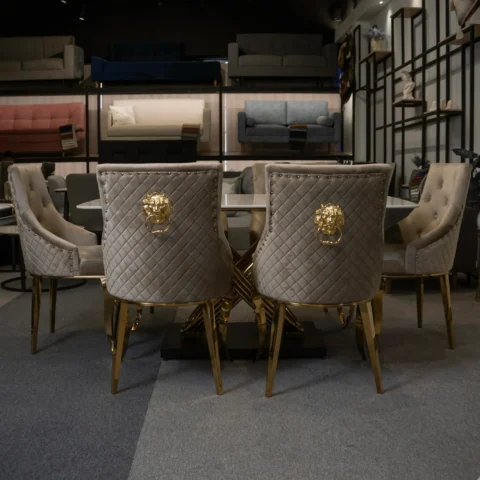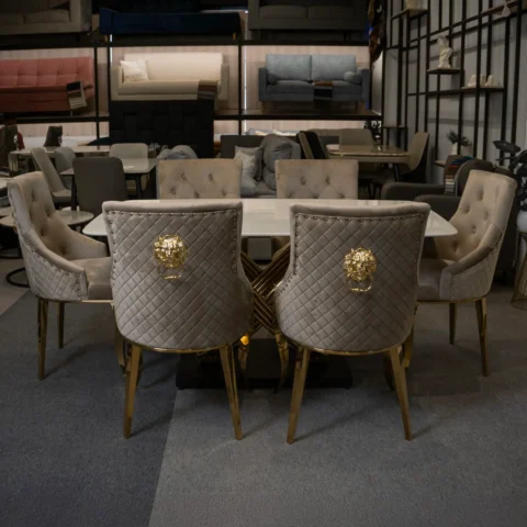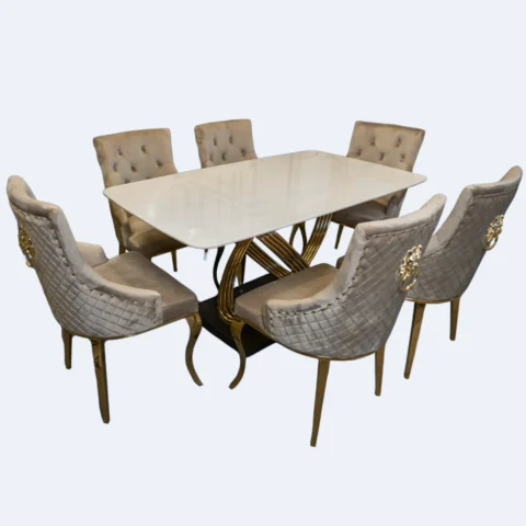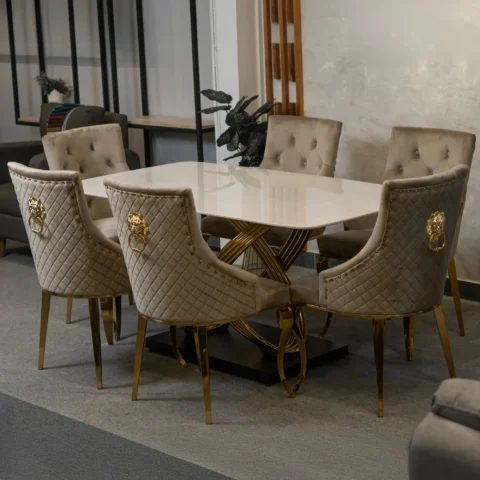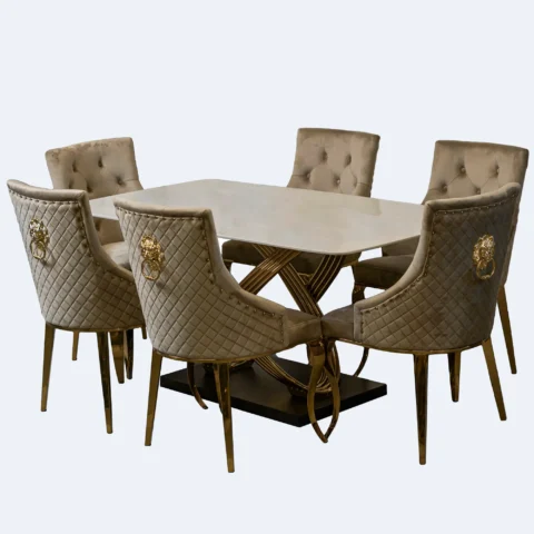 Eleva el estilo de tu hogar con el Set de Comedor Rubí de 6 puestos. Con mesa de piedra sinterizada resistente y estructura de acero dorado, combina lujo, funcionalidad y diseño contemporáneo. Ideal para espacios amplios que buscan sofisticación y confort.