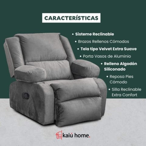 Hermosa silla reclinable tapizada en tela tipo velvet extra suave, agradable al tacto. Producto de alto confort y comodidad. Sistema de herraje que permite que esta recline. Rellena en algodón siliconado que aporta gran comodidad, madera pino seca en horno con tratamiento.