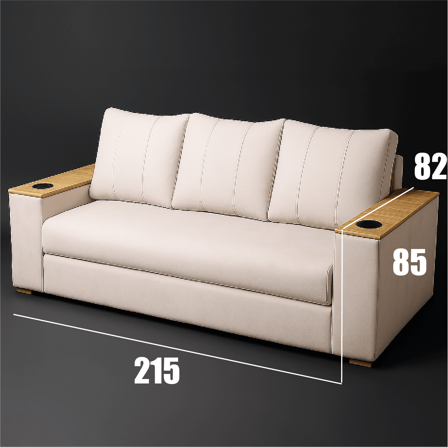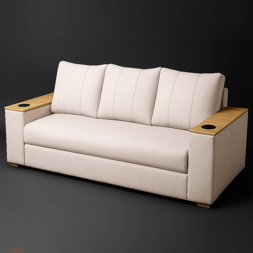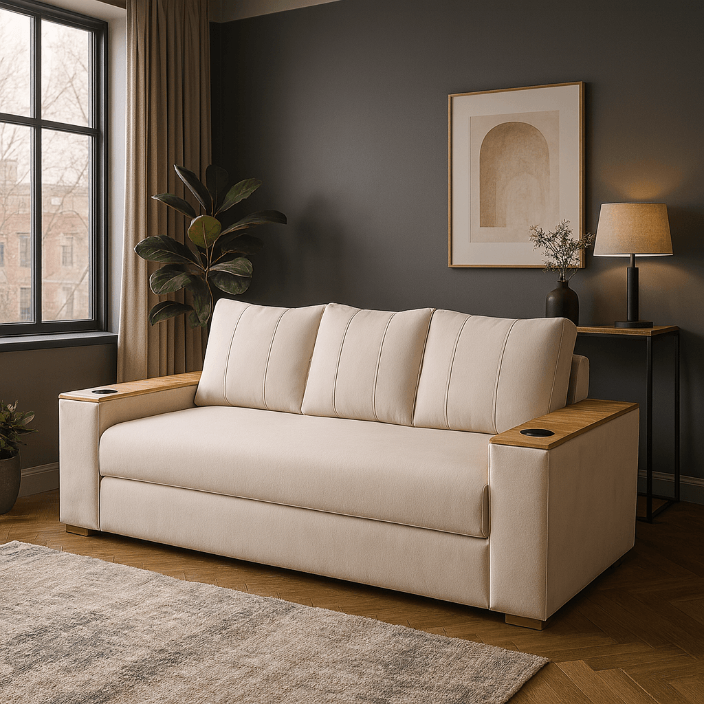 Sofá de diseño moderno con brazos anchos funcionales que integran superficies de apoyo y portavasos, ideal para maximizar comodidad y practicidad. Perfecto para salas contemporáneas, combina confort, resistencia y un estilo innovador pensado para el uso diario.