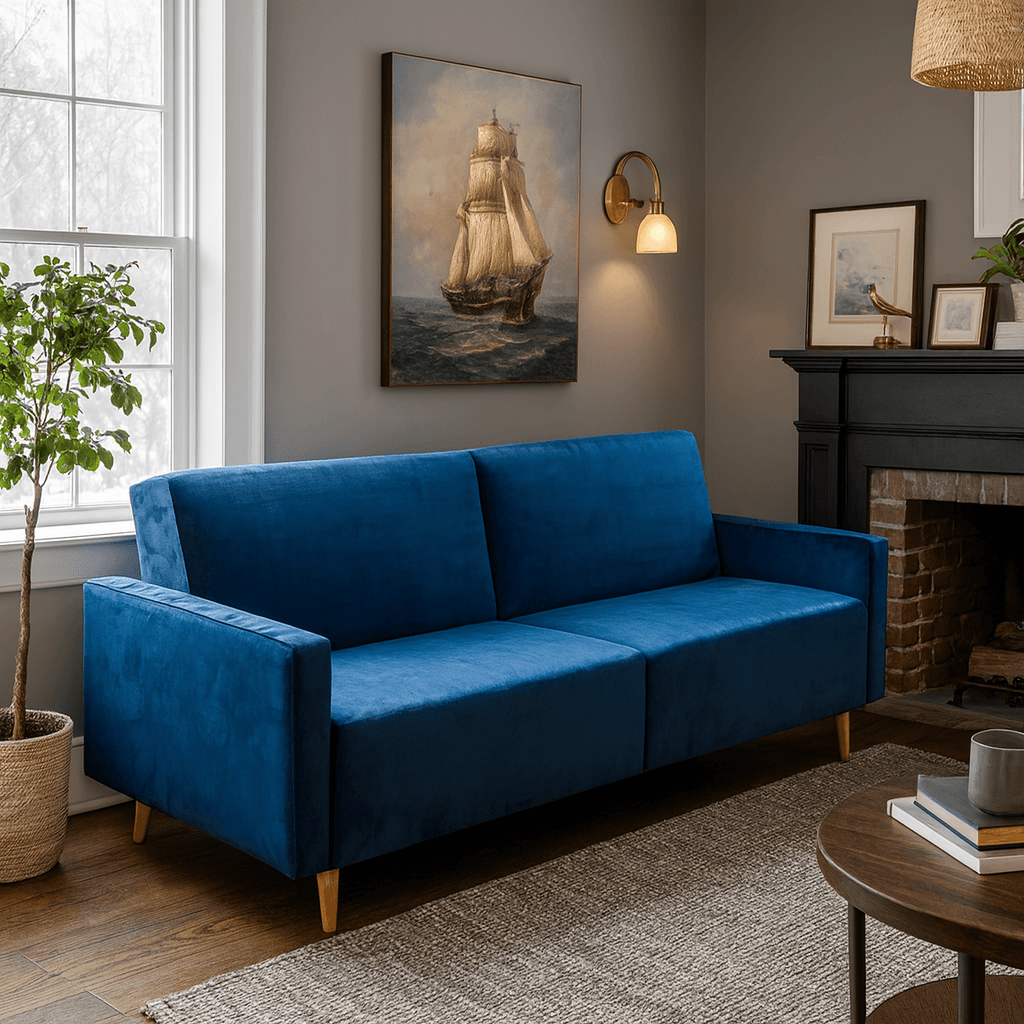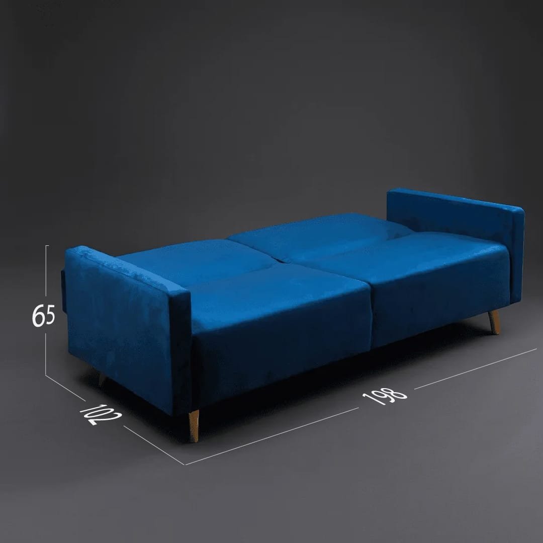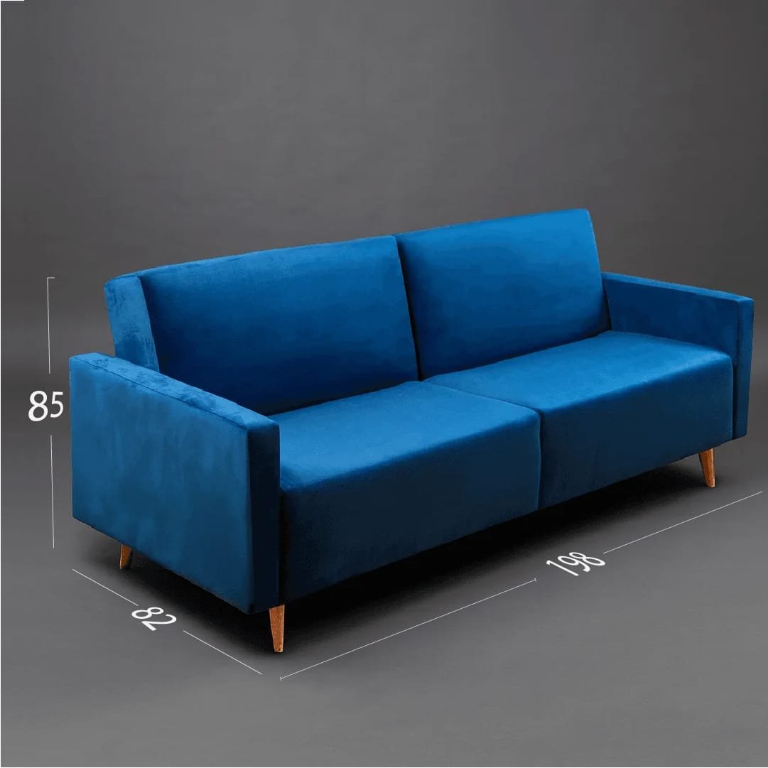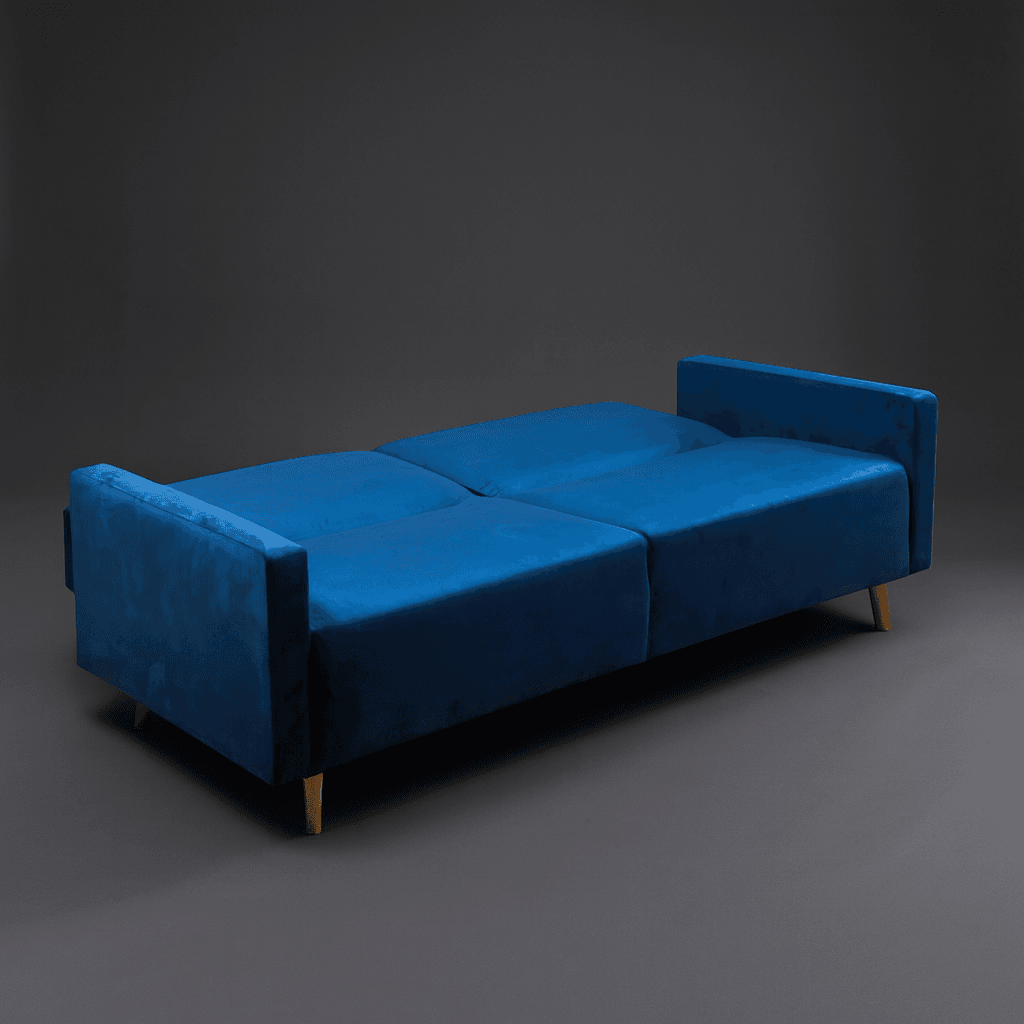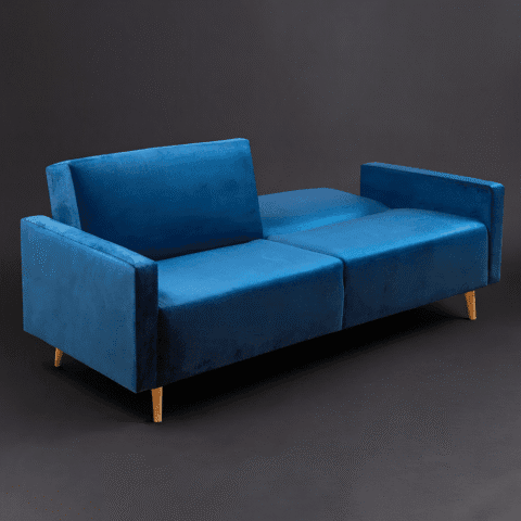 Sofá cama elaborado en tela tipo velvet que da visos y mayor suavidad, espumas de alta densidad, patas en roble macizo, madera seca en horno con tratamiento.