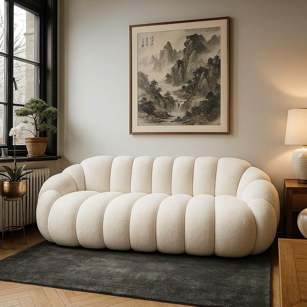 Calidad Excepcional: Elaborado con materiales de la más alta calidad, este sofá circular está diseñado para resistir el paso del tiempo y brindar comodidad inigualable. La tela tipo ovejera no solo es suave al tacto, sino que también agrega una sensación de lujo.
