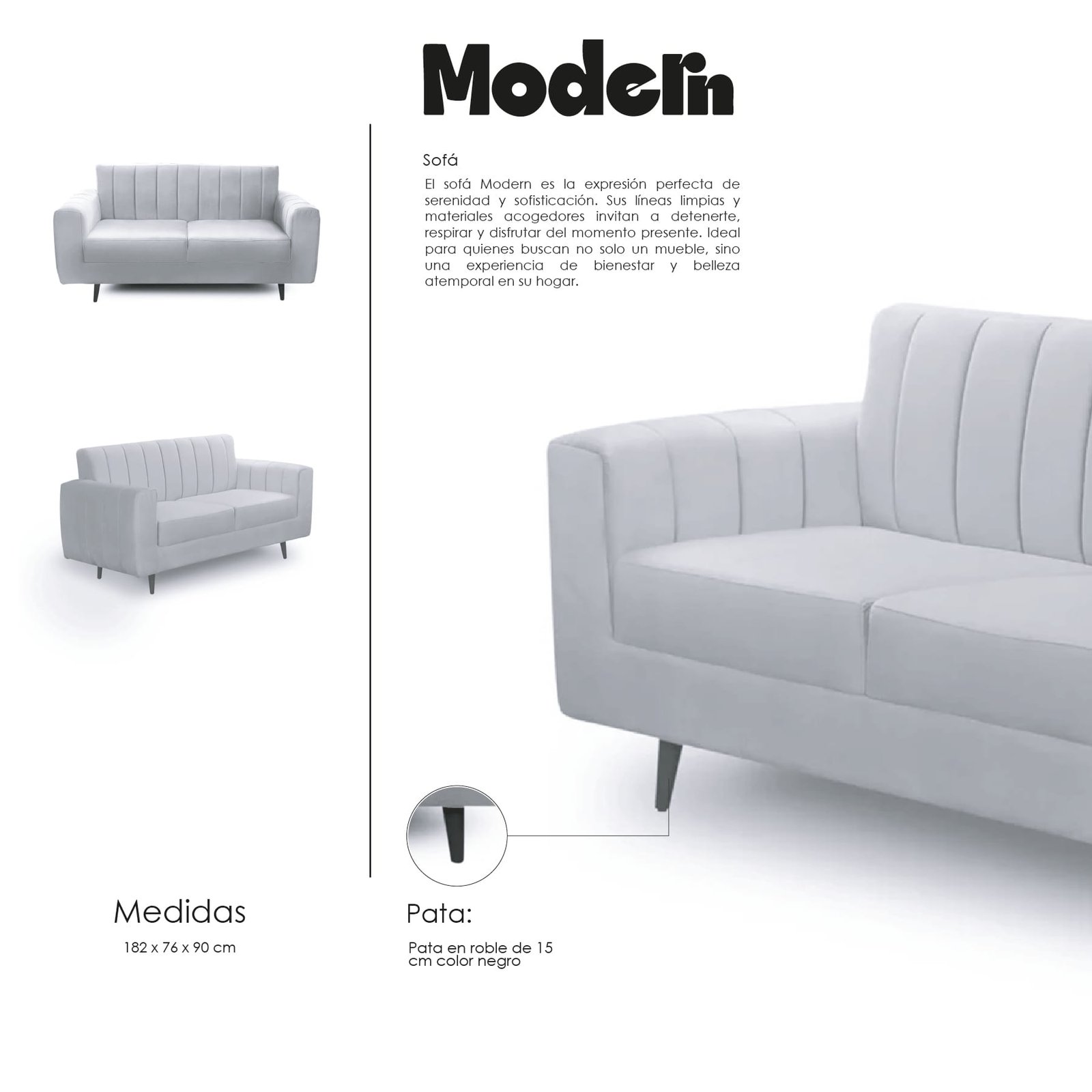 El Sofá Modern es la combinación perfecta de estilo y comodidad. Su tapizado en tela suave ofrece una sensación placentera, mientras que sus patas de roble aportan un toque cálido y elegante. Con una estructura resistente y materiales de alta calidad, este sofá es una opción duradera para cualquier hogar.